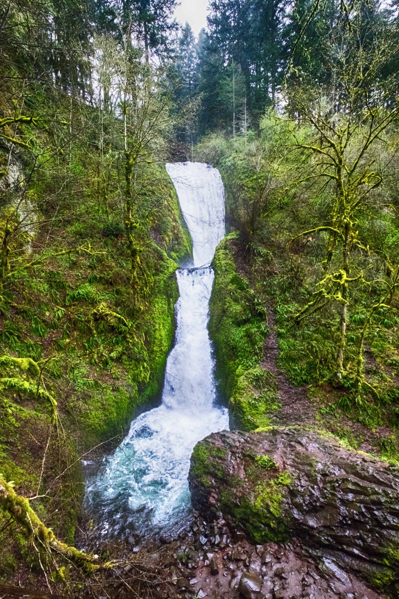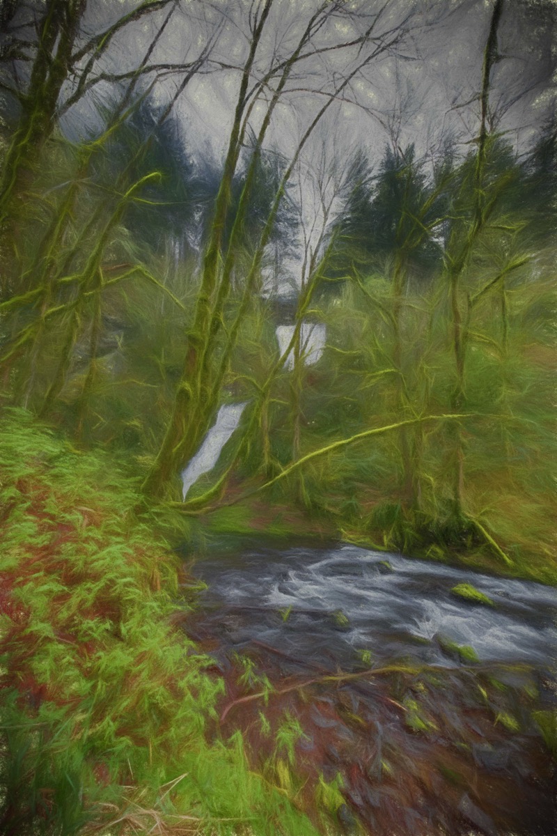 There has been an unusual amount of rainfall in the Pacific Northwest this winter, and the falls were flowing mightily. Â Below is Bridal Veil Falls as J. M. W. Turner might have imagined approaching it along the trail: