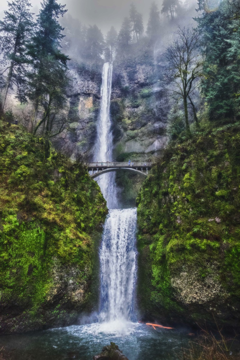 Multinomah Falls is more spectacular, as one would immediately note from the crowds there and not at Bridal Veil. Â It was misting and there was a fog as you can see at the top of the Falls.