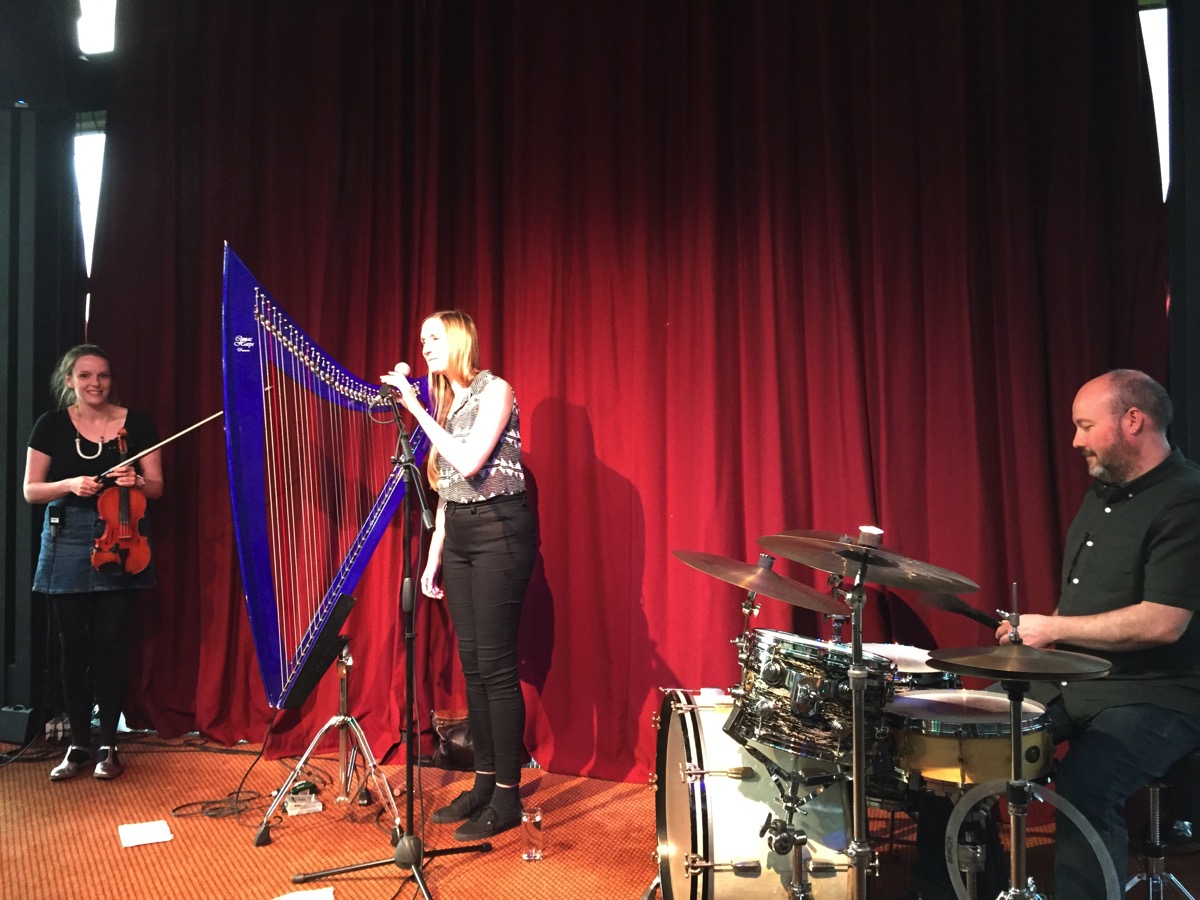 We were picked up at the train in Pitlochry by a porter from our lodging, The Fonab Castle Hotel, said porter wearing a proper kilt.  Very posh hotel, but not our favorite on the trip.  Situated on the bank of the Tummel River, the hotel is conveniently located close to town, and just up the road from the Pitlochry Festival Theatre.  After checking in we had a beer, nap, then dinner in the casual restaurant.  Then we went to the Theatre for a performance by the Rachel Newton Trio.  Rachel, the lead singer, played the harp as you can see below.  Very good show.